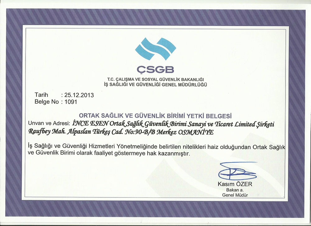 ış kazalarının ve meslek hastalıklarının mümkün olan en aza indirildiği,insan odaklı toplumun birer üyesi olmak ınce Esen OSGB ailesinin en büyük hedefidir.